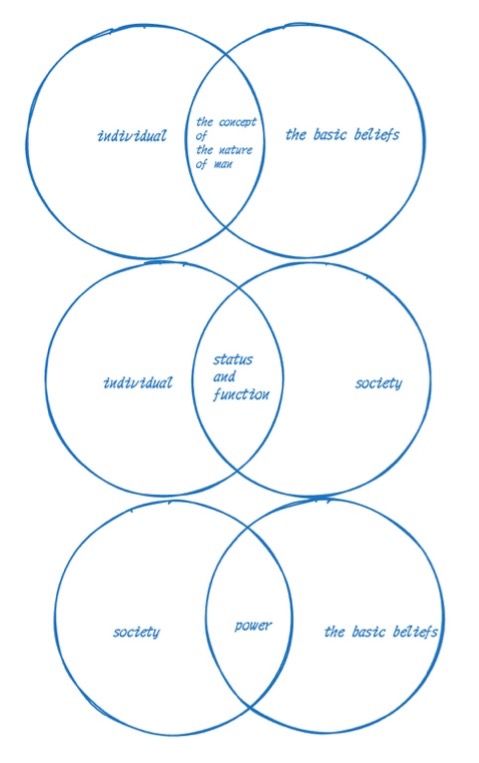 Tension between the individual and society’s basic beliefs. “Society’s basic beliefs” refer to two questions every society must answer: What is human? How should humans achieve fulfillment in life? Christianity provided answers to these questions, while Hinduism and Buddhism offered different answers. European society as a whole is a Christian civilization. Throughout its long history, Europeans’ understanding of these two questions was shaped by Christianity. However, in different historical periods, Europeans sought their fulfillment in different social domains, leading to different “concepts of the nature of man” such as Spiritual Man, Intellectual Man, and Economic Man. Spiritual Man, Intellectual Man, and Economic Man all pursued the freedom and equality revealed by Christianity, but they sought these in entirely different domains. Thus, we have one set of tension: the tension between individuals and beliefs about human nature, with the “concept of human nature” serving as the mediator of this tension.
